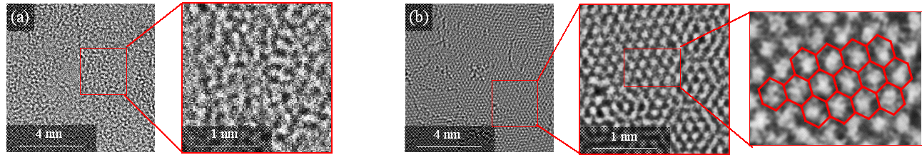 図1(c)、(d)の伝導機構に対する模式図で示すように、薄膜内に欠陥構造が多い場合(図1(c))、欠陥構造がキャリア(電子・ホール)の流れに対して大きな壁となる。キャリアは熱エネルギーの助けを借りてこの障壁を乗り越えるようにホッピング伝導する。これは、キャリアにとって大きなエネルギーを必要とし、著しい移動度の低下を引き起こす。一方で、欠陥構造の領域が減少すると障壁の高さが低下し(図1(d))、キャリアの流れはスムーズになり、グラフェンの結晶性を反映したバンド伝導を示すことが期待される。