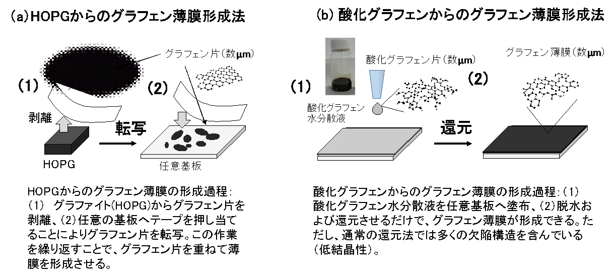 一方、酸化グラフェンは親水性のため水によく分散させることができるので、その水溶液を基板上に滴下して水分を飛ばし還元するだけで、容易に厚さ1-3層分の薄いグラフェン薄膜を形成させることが可能となる(図2(b))。そのため、グラフェンを大量に合成する原料として、酸化グラフェンの合成法や還元法が世界中で研究されている。
