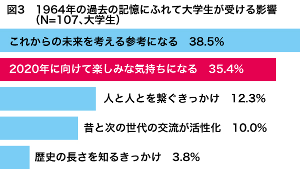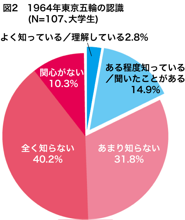 東洋学園大学が実施した調査(※注1)では、1964年の東京オリンピックをよく知らない若者が80%を超える一方で、1964年の過去の記憶が2020年を盛り上げる要因になると回答する割合は35%を超えている(※図2)。