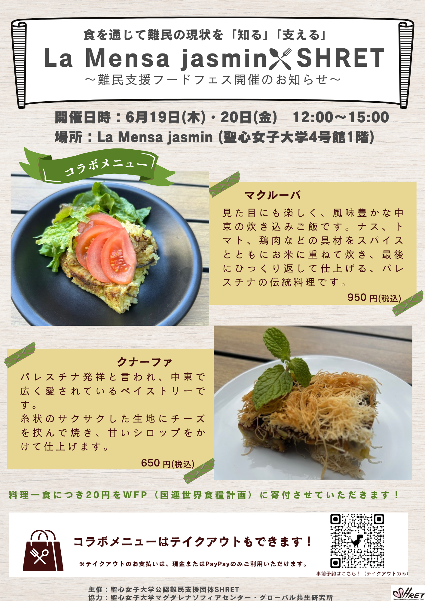 「SHRETウィーク」の一環として、6月19日(木)・20日(金)には学生食堂「La Mensa jasmin」とコラボした「難民母国メニュー」を販売する。今回は、中東東部地域レバント地方・パレスチナの郷土料理である「マクルーバ」(メイン料理)と「クナーファ」(デザート)を提供。1食につき20円をWFP(国連世界食糧計画)に寄付し、食を通して難民問題について考えるきっかけとすることを目指す。概要は下記の通り。