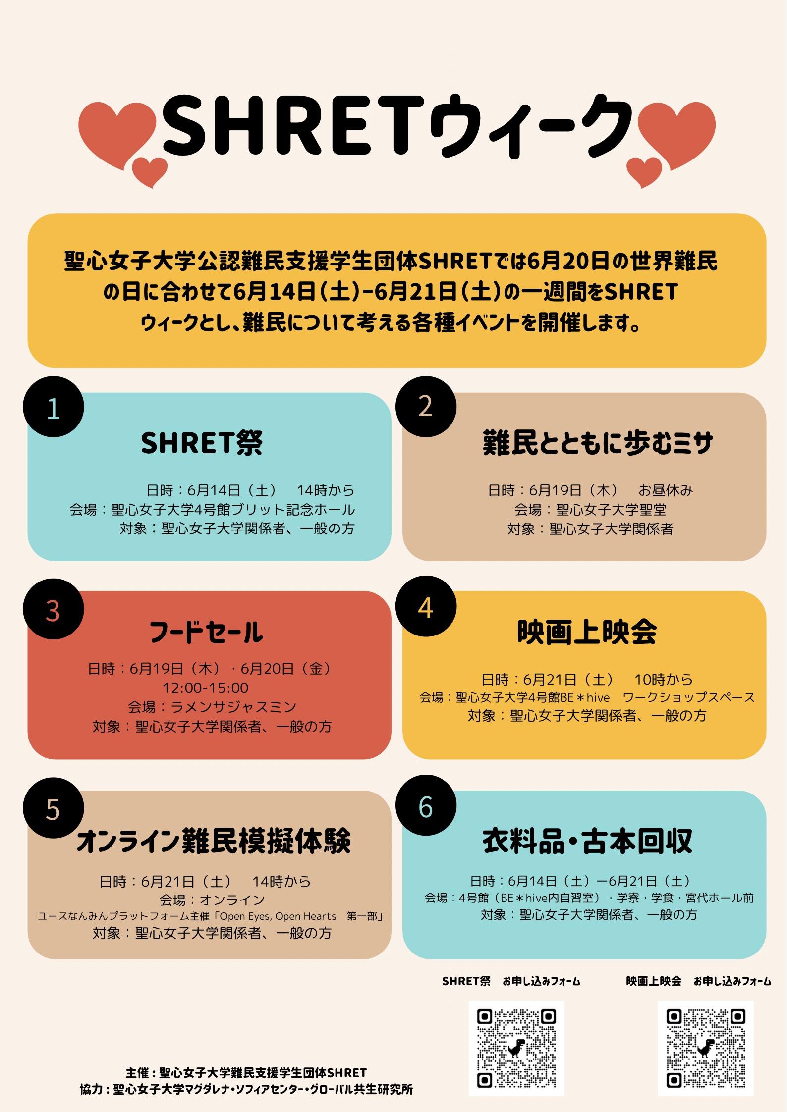 同団体では毎年、6月20日の「世界難民の日」に合わせてイベントを開催。今年は6月14日(土)~21日(土)の期間を「SHRETウィーク」として各種イベントを開催する。