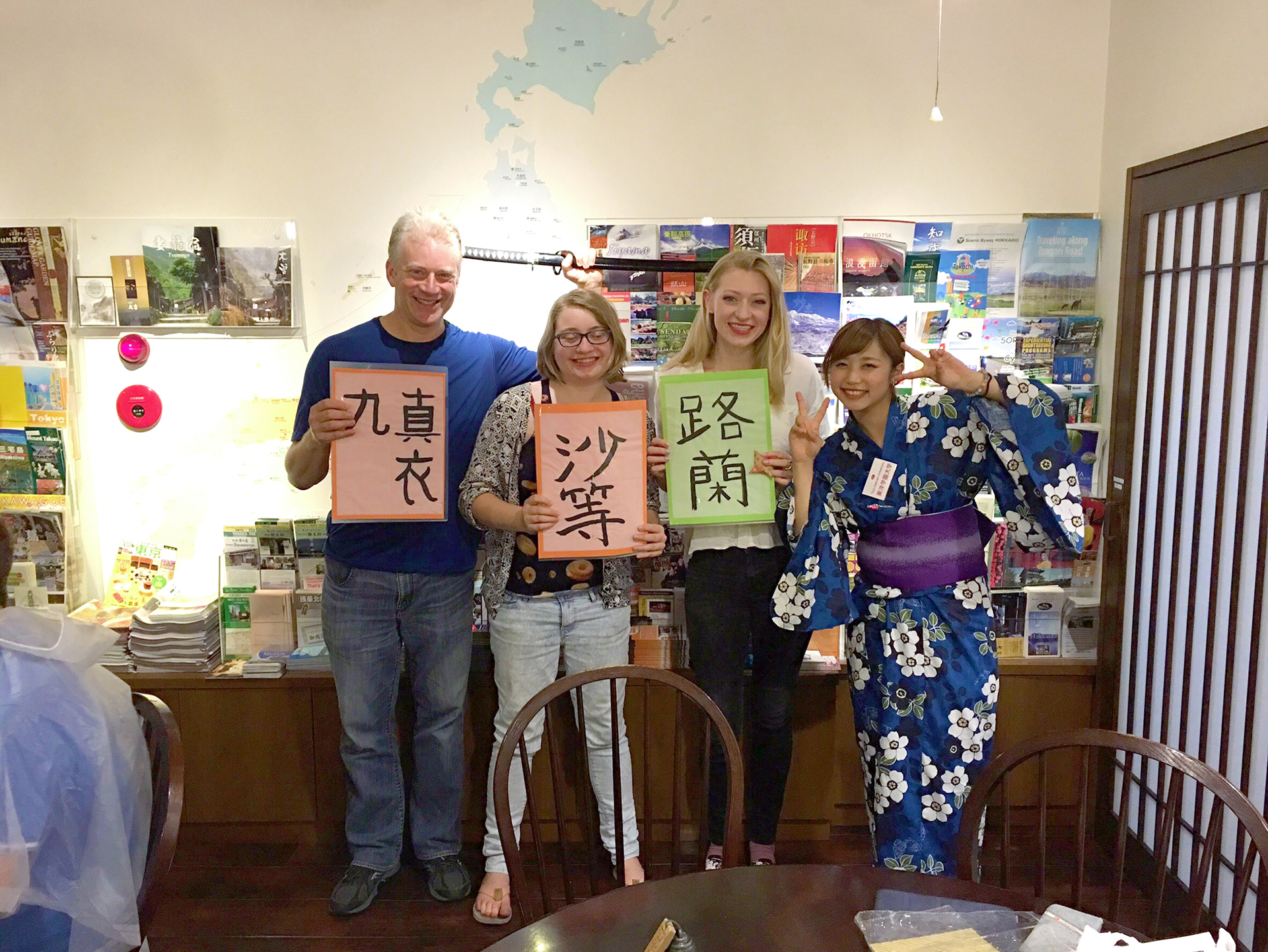 学生たちは書道指導のほか、歌舞伎や折り紙など日本文化を紹介するなど、ジェスチャーや片言の英語を駆使して参加者とコミュニケーションを図った。