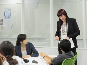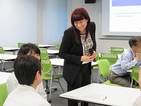 「同じクラスに国籍・文化・英語修得レべルの異なる学生がいる場合の指導法」という例題について各グループで話し合いを行い、まずはその問題点として、英語で話す経験の不足、ボキャブラリーの不足等の理由から、学習者間のレベルに差があることが挙げられ、その上でどのように全ての学生のレベルに合わせた授業を進めていくかについて更に活発な意見交換が行われた。