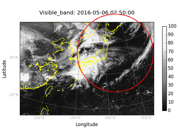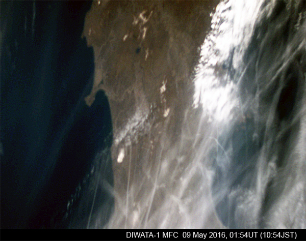 写真1aは、広視野モノクロ魚眼カメラ(WFC)により撮影された画像(2016年5月6日11時55分撮影)で、画面の右辺には衛星自身の一部が写り込んでいる。写真1bはほぼ同時刻に撮影された気象衛星「ひまわり」の画像で、日本上空を覆っている雲の形が一致していることがわかる。