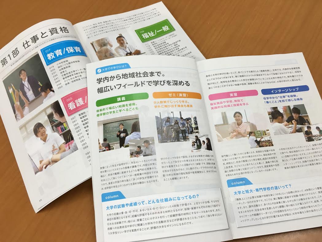 『未来発見ガイドブック-大学での学びと未来の自分を探す-』は、昨年に引き続き「仕事と資格」「大学案内」の2部構成で編集されている。