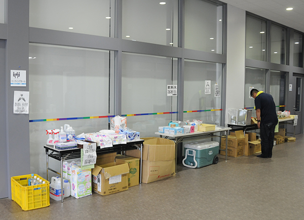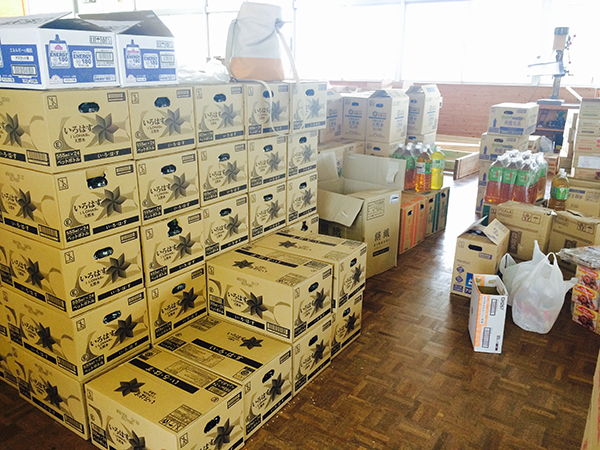 地震発生時から一時避難所となった熊本市立井芹中学校(熊本市西区)では、宮城さん、田中さん(ともに宇宙航空システム工学科 航空整備学専攻4年)ら約15人の在学生が、多い時で約1,500人の避難者をサポート。県外から届く物資の支給や配布、管理を行った。地震発生直後は物資が足りず、一家族におにぎり1個しか渡せないときもあったという。