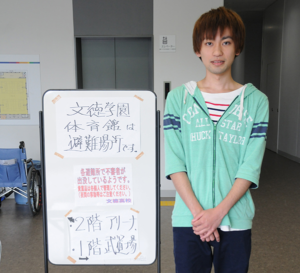一方、文徳高等学校(熊本市西区)の体育館では、徳永さん(応用生命科学科1年)と手嶋さん(同学科2年)がボランティアに取り組んだ。手嶋さんは実家が福岡のため、避難所にずっと泊まり込みで活動。また、徳永さんは益城町にある実家が全壊し大変な状況にありながらも、文徳高校の生徒たちや先生と協力し、多い時で120人程の避難者のサポートを行った。