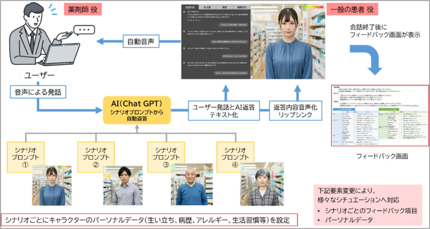 ・生成AIの技術を用いて、AI患者との対話により、相手や時間にとらわれずに服薬指導のトレーニングが可能。