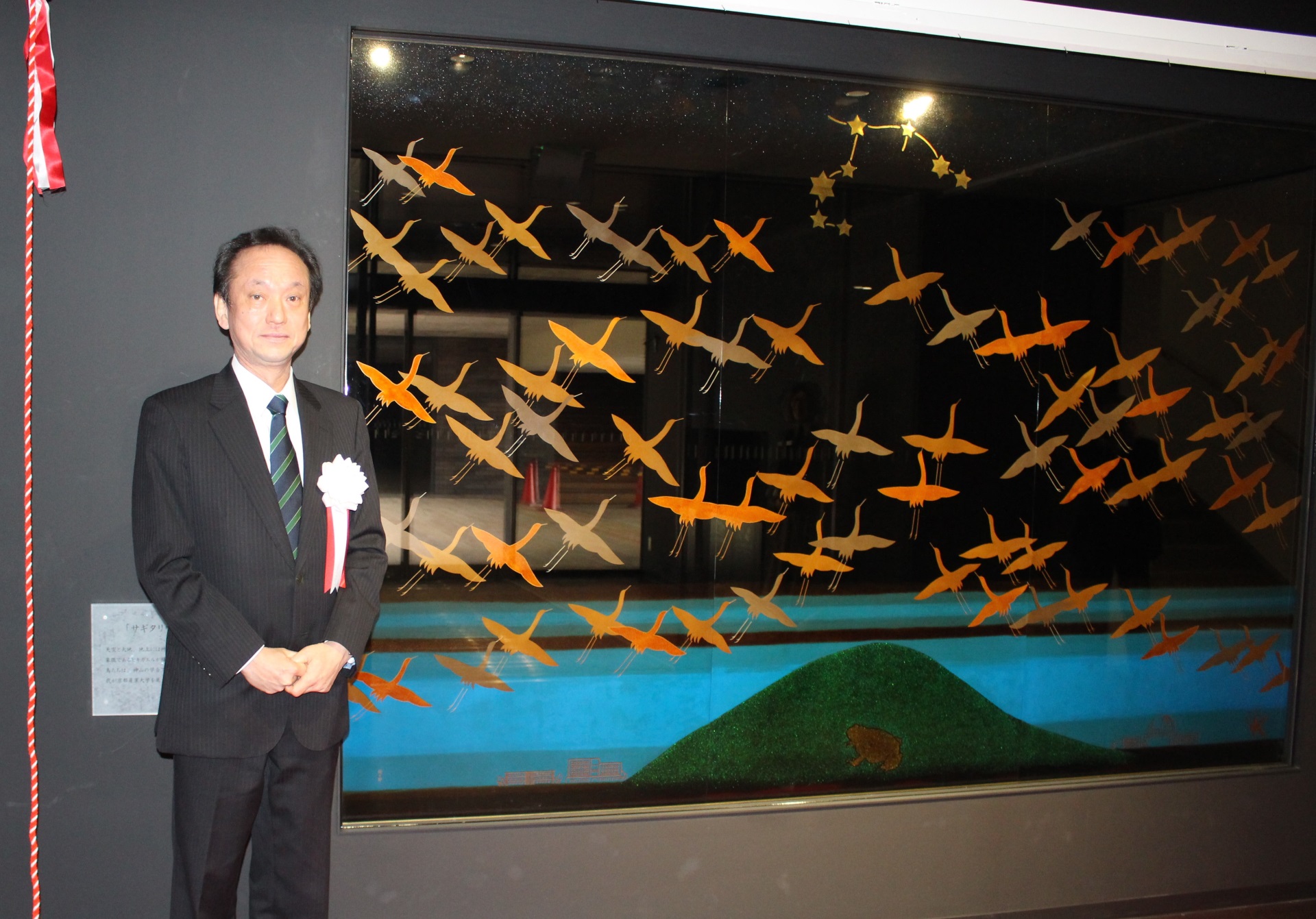 1階エントランスには、下出蒔絵司所3代目である下出 祐太郎 教授(文化学部 京都文化学科)の蒔絵パネルを展示している。この蒔絵は「『サギタリウスへ』-大志をはぐくむ」と名づけられた。