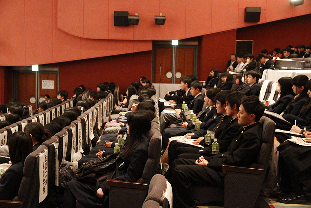 当日は,学内外の関係者に加え,県内の8つの高校(同大附属高校および県内7つの公立高校)から、現役高校生160名も参加し、海外経験をもつ同大の学生3名と高校生3名が、パネルディスカッションとして「スーパーグローバル人材に必要なものとは」をテーマに熱のこもった討議を繰り広げた。