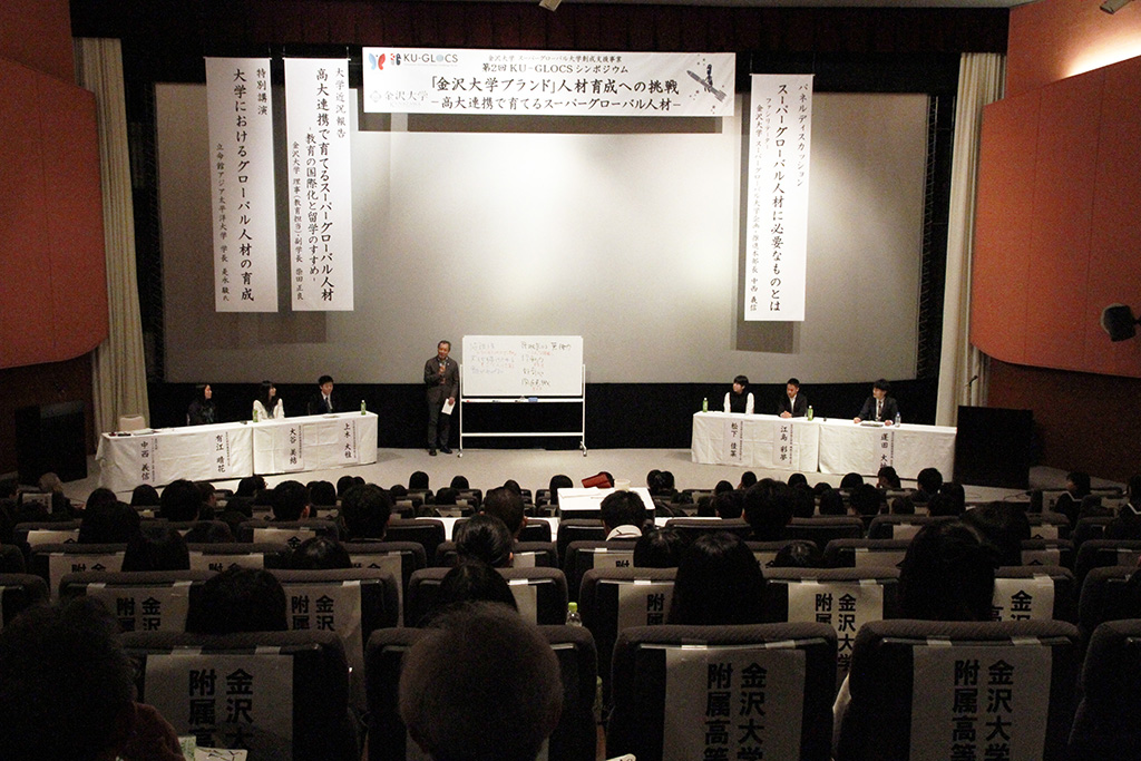 金沢大学は、平成26 年度に文部科学省の「スーパーグローバル大学創成支援事業(SGU)」(タイプB:グローバル化牽引型)に採択され、わが国の社会のグローバル化を牽引するための先導的な取り組みを進めている。こうした中、3月26日には第2回KU-GLOCSシンポジウム「『金沢大学ブランド』人材育成への挑戦―高大連携で育てるスーパーグローバル人材―」を開催した。