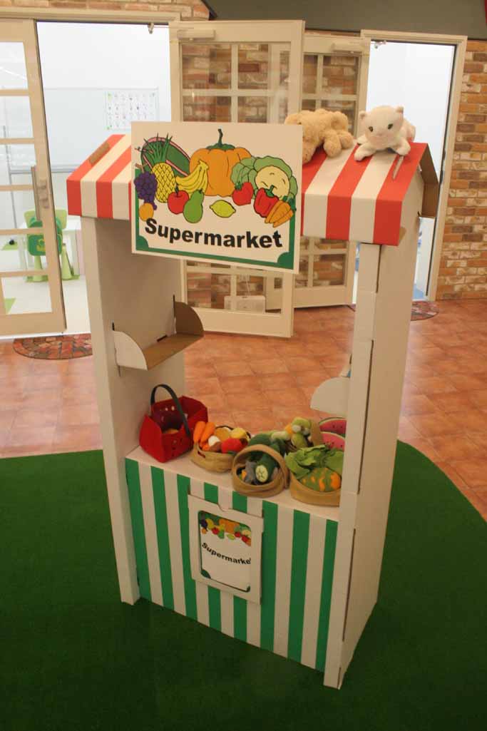 英国の街並みをイメージした川崎教室は50坪の教室面積を有し、教室前に設けられた20坪の広場があるのが特徴。教室で習ったことを広場で実践し、その場に応じた言葉を体感できる。