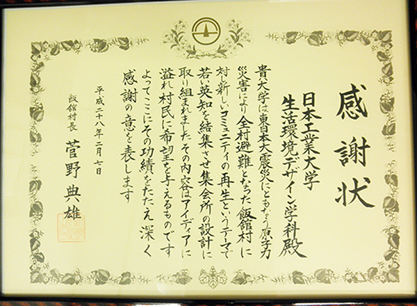 日本工業大学の生活環境デザイン学科に福島県相馬郡飯舘村長より感謝状が贈られた。