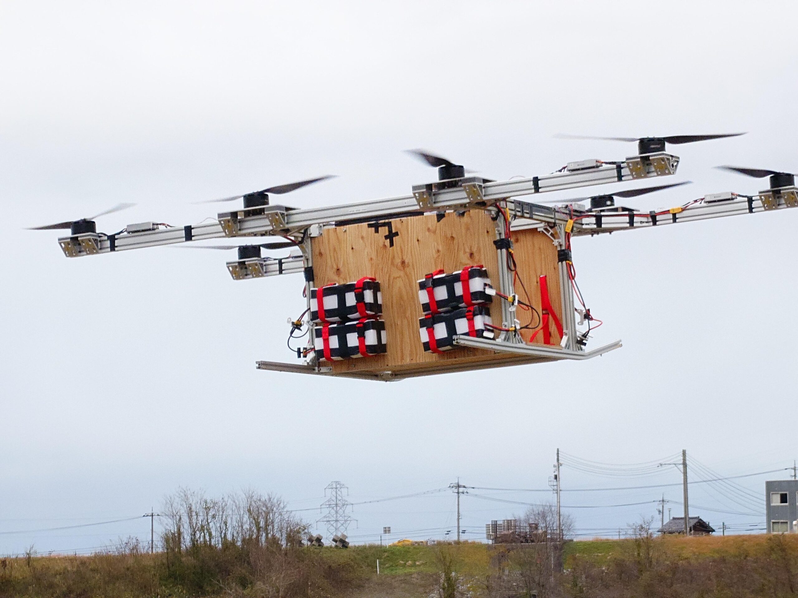 ステップ1で開発した大型ドローン0号機は2025年3月に手取川河川敷にあるラジコン飛行場で、積載量50kg超の飛行実験に見事成功し、現在開発中の山間地・離島・被災地での物資輸送用大型ドローンの実用化に弾みがつきました。