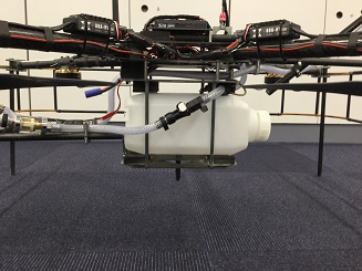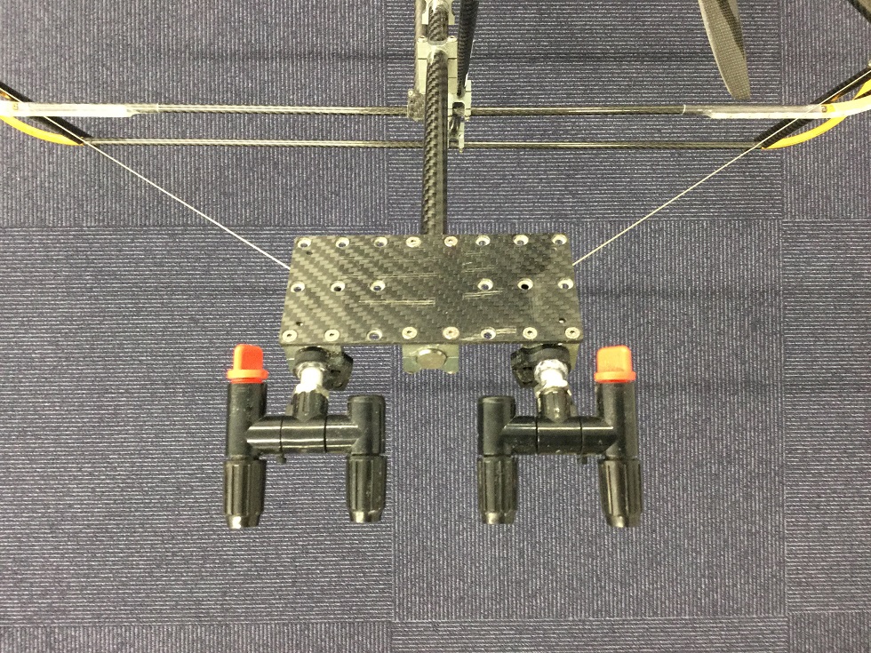 コンクリート材料、構造物の維持管理方法などについて研究を進める伊代田准教授は、構造物に対して適切な補修材料や補修方法、これを実現するためのドローン運用方法に関するアイディアを提供し、同社と共同で実験を進めてきた。今回製作した試作機は、既存の機体を改造したもので、2Lのタンクで水や補修材料を蓄え、4本のノズルを使って散布する。ノズルは散布角度のほか、先端を回すことで水流や水圧を調整でき、実験では1m2平均18.3秒で吹付ができることを確認した。農薬散布ドローンに見られるような下方向・広い範囲ではなく、上下左右方向・狭い範囲でピンポイントに散布ができるのも特徴。