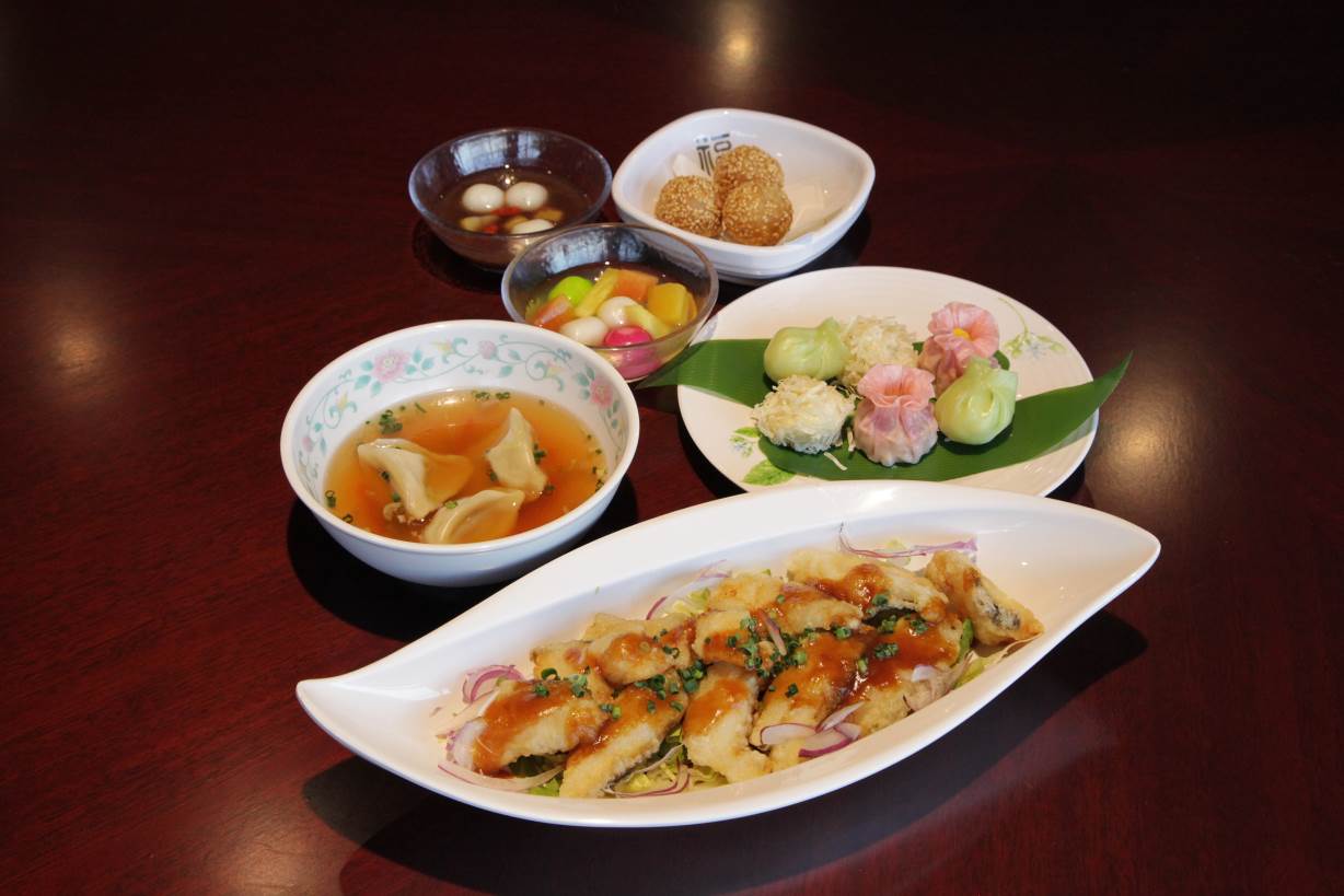 油淋鶏、四川麻婆豆腐、点心2種、白身魚唐揚げ香味ソース、中華くらげ、水餃子、酸辣湯麺、桃饅頭、フルーツ白玉等のプレートセット。