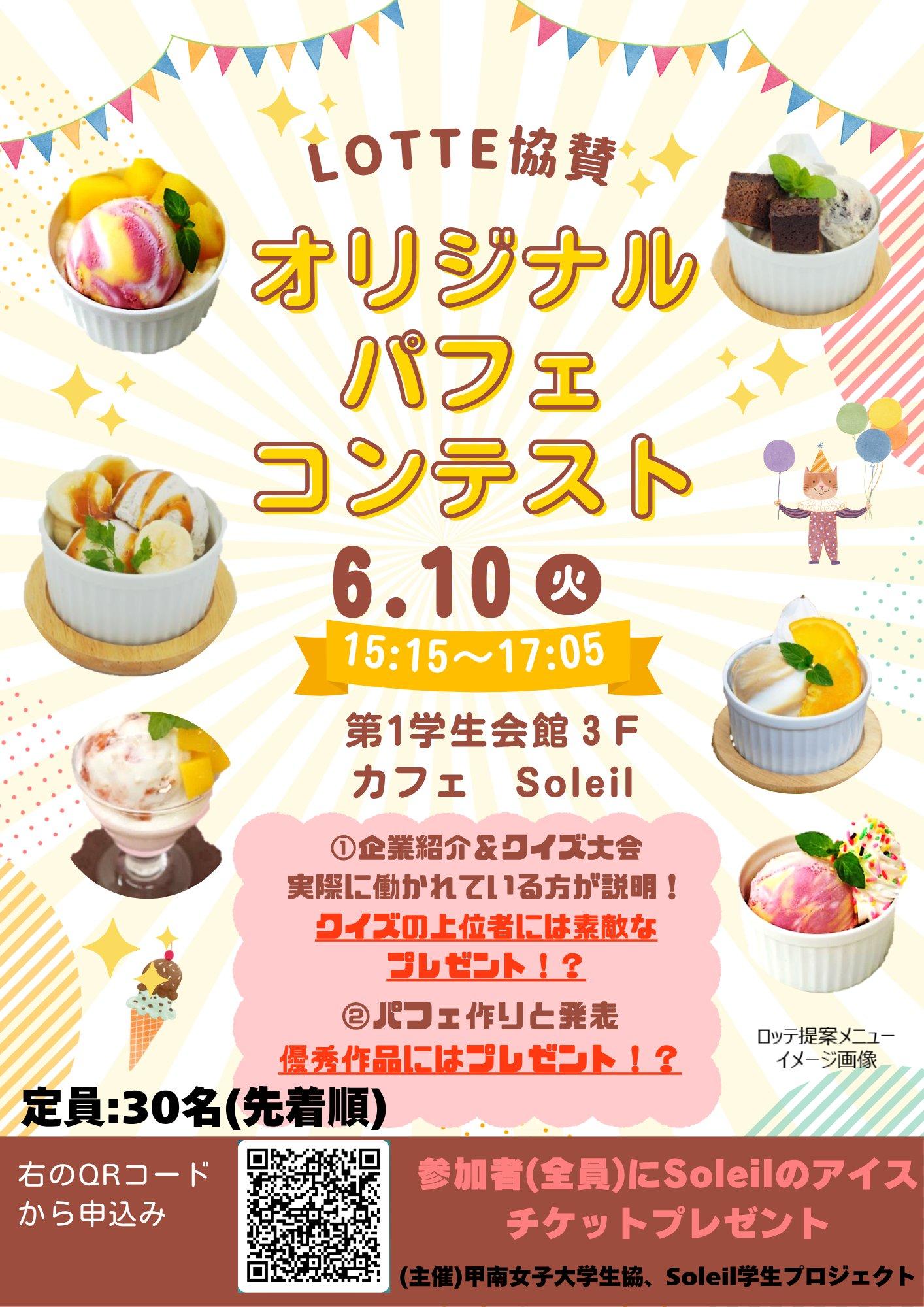 甲南女子大学(神戸市東灘区)では株式会社ロッテ(東京都新宿区)の協賛のもと、学部生を対象とした「オリジナルパフェコンテスト」をBookカフェ「Soleil(ソレイユ)」で実施いたします。