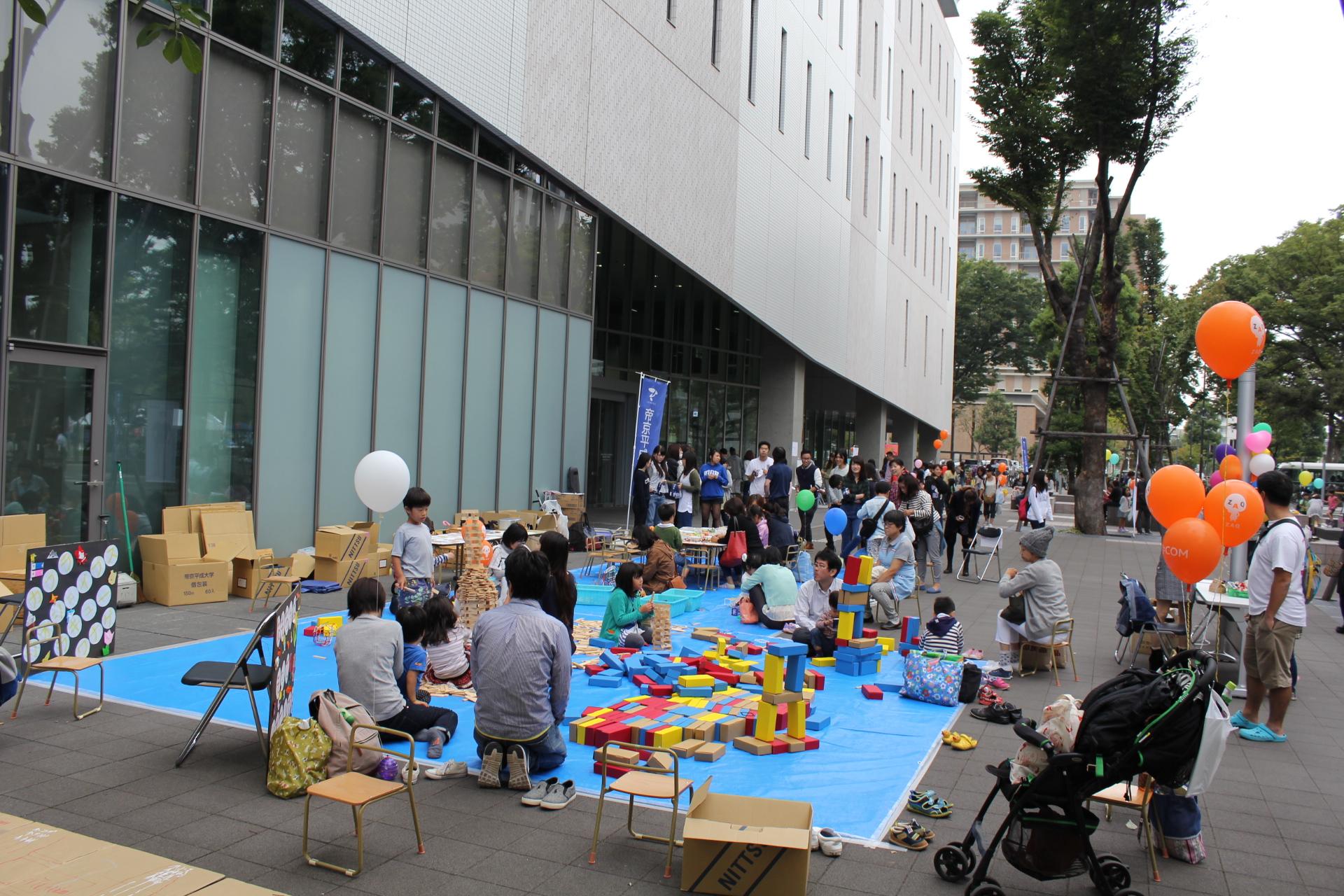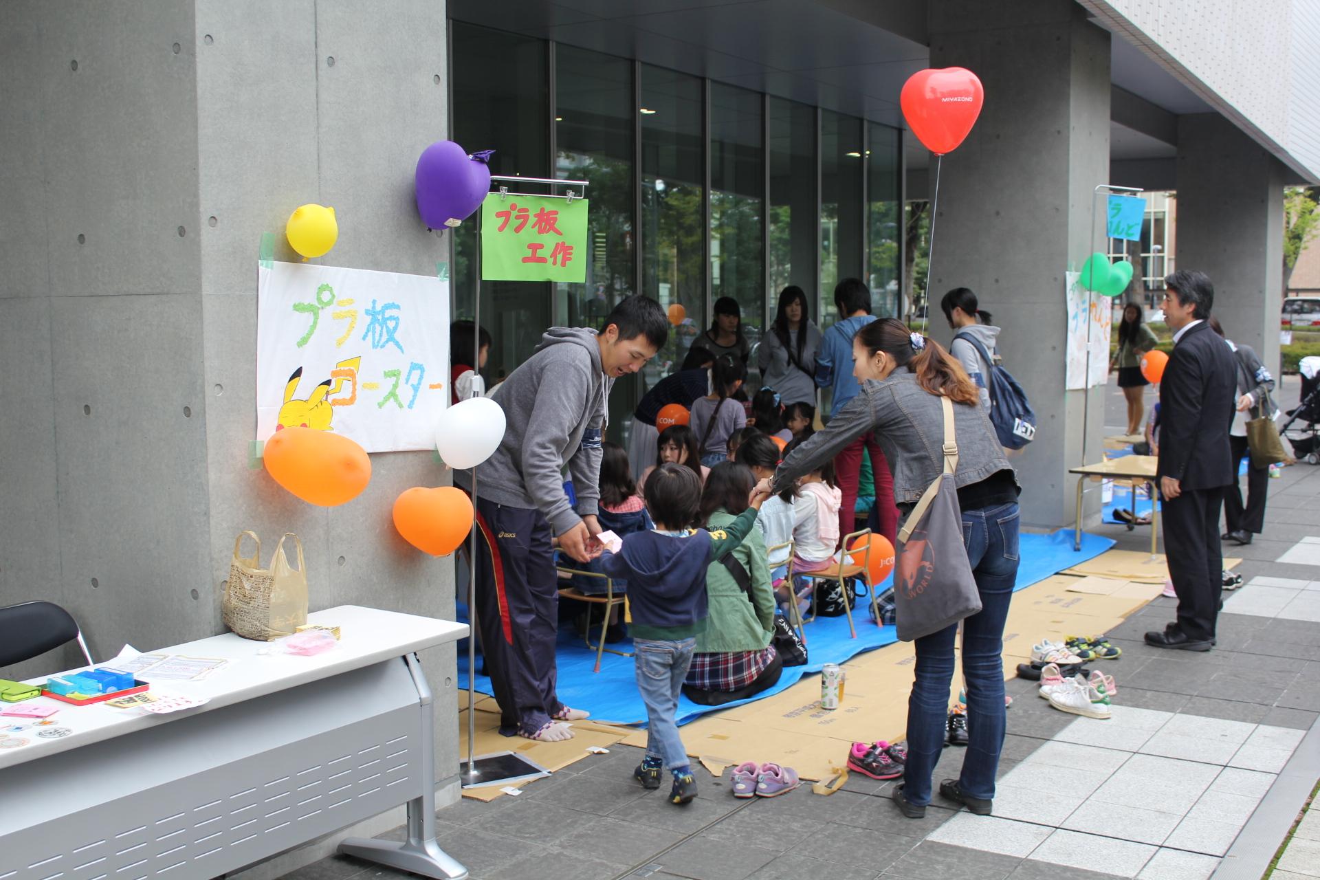 今年度は、中野四季の森公園内の子ども向けイベントとして、児童学科と観光経営学科の学生が「えんにち」「キッズふれあいコーナー」「工作教室」を中野キャンパス正面玄関前で行った。当日は一時天候に左右されたが、両日ともに大盛況となり、中野キャンパス正面玄関前は子どもたちでにぎわい、今年のにぎわいフェスタを大いに盛り上げることができた。