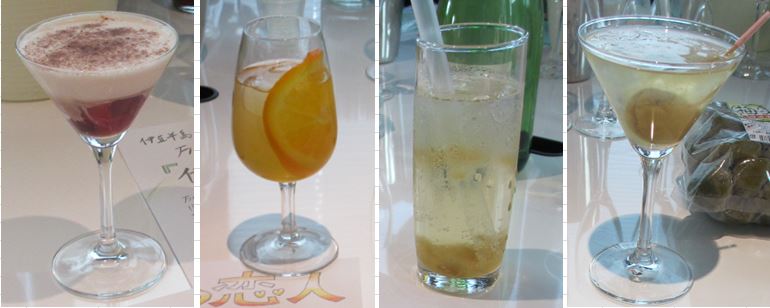 今回は、静岡県伊豆市と福井県若狭町とのコラボ。ぶどう酢を加えた伊豆の地酒あらばしりに生クリームを乗せて、ふわっとした口当たりが楽しめる「サプライ酢」と、海に沈む夕陽のロマンチックな世界をグラスいっぱいに表現した「甘夏の恋人」の2種類を「伊豆カクテル」として発表。また、地酒の若狭自慢と希少価値の高い紅映梅(べにさしうめ)を合わせた「Umany(ウメニー)」と、同じ地酒を使って梅シロップと梅の実を丸ごと1個加え、三方五湖の澄んだ水を表現した「MIKATA 五湖」の2種類を「若狭カクテル」として発表した。