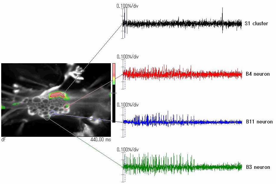 まず、アメフラシの味覚認識を司る神経節を蛍光色素で染色した後、アメフラシが好むワカメと、嫌いなテングサをそれぞれ与えて味覚を認識させると、脳内の特定部位が活動し、しかも、好きな味覚に比べ、嫌いな味覚への活動はより速く始まると解った。