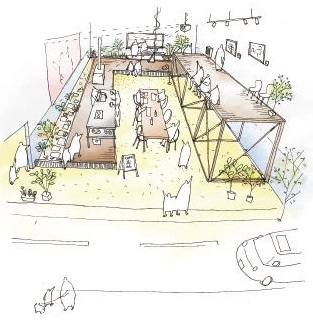 地域住民、観光客、学生など、この地を訪れるひとびとを「食」でつなぐシェアキッチン。メインストリートに対して全面的に開放することで、気軽に人々が立ち寄って調理をしたり、飲食を楽しんだりすることができる。