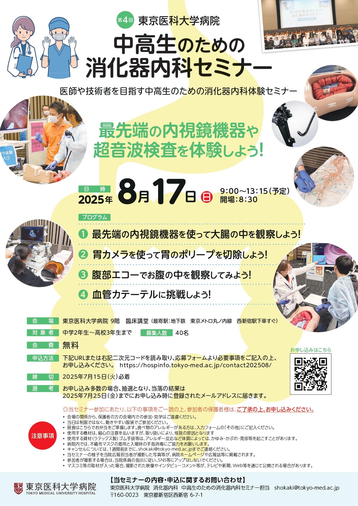 東京医科大学病院消化器内科(新宿区西新宿、主任教授:糸井隆夫)は2025年8月17日(日)、中学2年生~高校3年生を対象として、最先端の内視鏡機器や超音波検査を体験できる「第4回 中高生のための消化器内科セミナー」を開催する。好評だった第1回~第3回に続く実施で、シミュレーション体験を通して中高生が「医療」に興味を持ち、将来、医師や技術者を目指すきっかけとなることを図る。また、それをもって将来の医学や医療技術の発展への貢献となることも期待される。参加無料、要事前申込(定員40名・締切:2025年7月15日(火))。