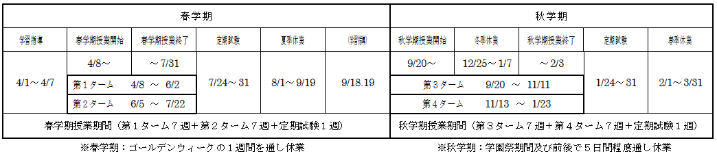 新たな学年暦では、1学期14週の新たな授業期間を7週ごとに2つのタームに区分し、春学期と秋学期の「2学期4ターム制」とする(*3)。この学年暦の導入により、クォーター期間(7週)で完結する授業が可能となり、学生がより海外留学に挑戦しやすい環境が整う(*4)。また、祝日の授業実施日も大幅に削減され、ゆとりのある学年暦が構築される。