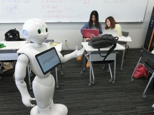 国際日本学部設置の、国際日本学実践科目C(担当:岸磨貴子特任講師)では、来日する外国人に日本の魅力を伝えることを目的に、全14回の講義を通して「ペッパー」を活用した映像コンテンツの制作を行った。