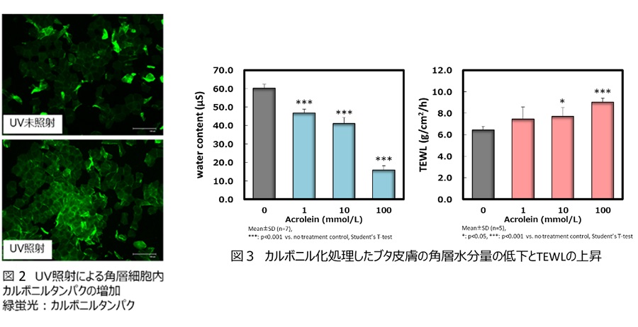 太陽光線の皮膚への慢性的な曝露は、皮膚内の酸化ストレスを亢進することにより老人性色素斑やシワの顕在化といった光老化皮膚の形成を促進することはよく知られているが、近年、露光部位の皮膚の角層および表皮、真皮組織内に、酸化タンパクであるカルボニルタンパクが多く存在することが明らかになっている。また疫学的な調査では、角層のカルボニルタンパクと皮膚表面の水分量および経表皮水分蒸散量(TEWL)に相関があることや、冬季の乾燥性皮膚においてカルボニルタンパクの増加が報告されている。同研究チームでも、再構築皮膚モデルを乾燥条件下で培養することによりカルボニルタンパクが増加することを確認している。