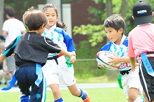 タグラグビーは、タックルの代わりに相手選手が腰に着けた帯状の「タグ」を取るというスポーツ。横浜市内の小学校では、学習指導要領にタグラグビーが例示される以前の2002年から、体育の授業に取り入れられたこともあり、多くの子どもたちがタグラグビーを楽しんでいる。