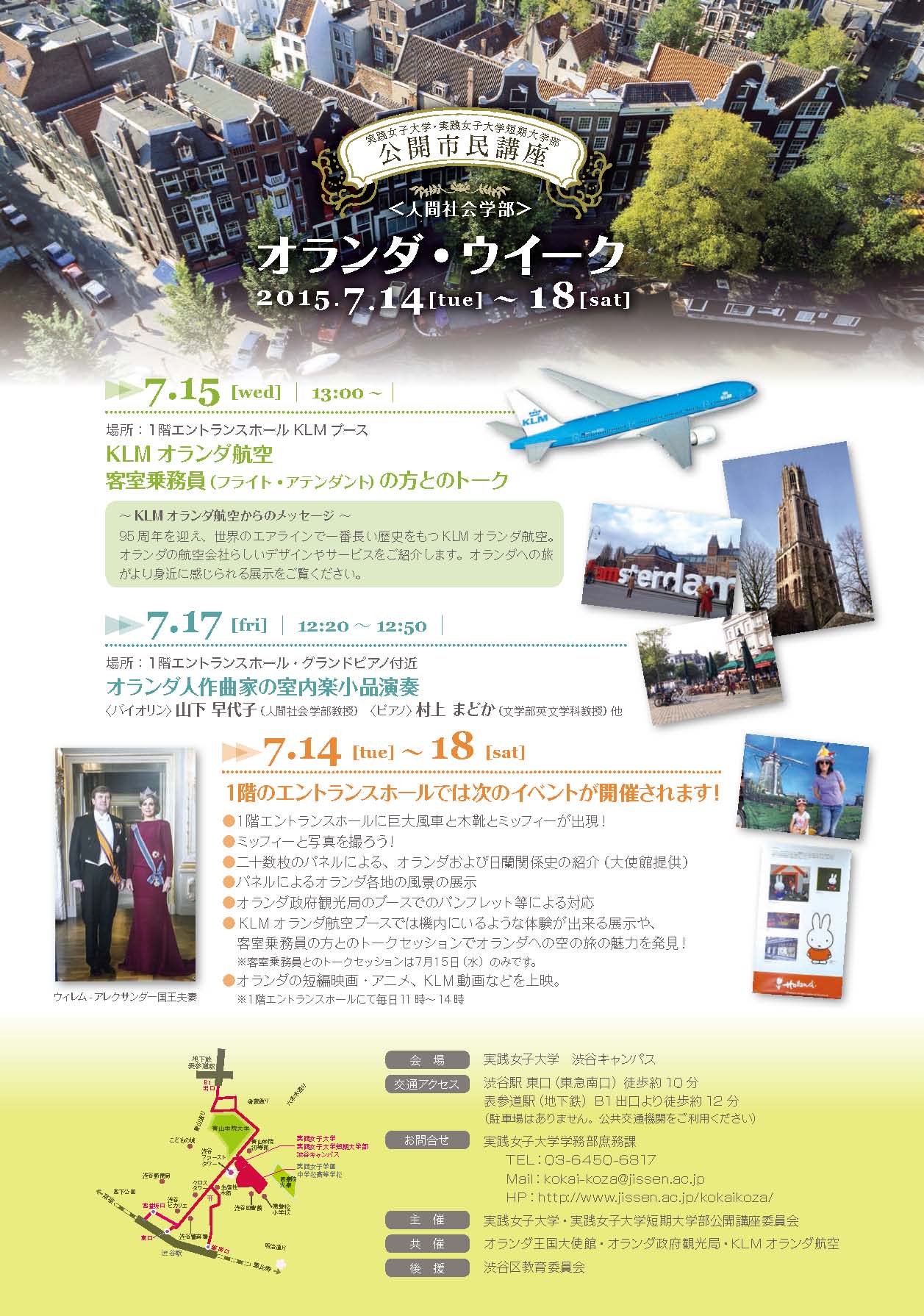 7月14日(火)~18日(土)の期間は、渋谷キャンパス創立120周年記念館で「オランダ・ウイーク」を開催。(大使館提供によるオランダ各地の風景や日蘭関係史のパネル展示、オランダ政府観光局およびKLM(オランダ航空)のブース設置等)