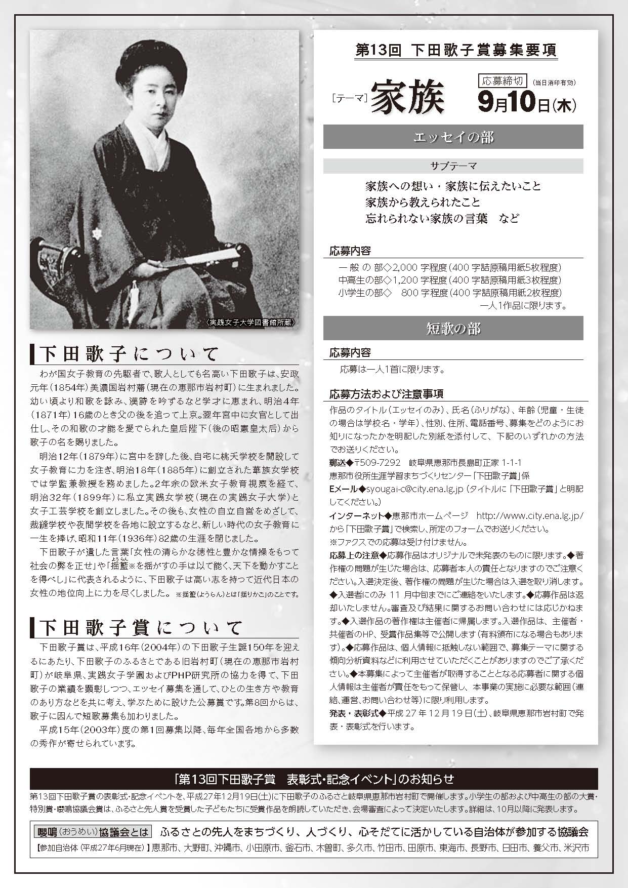 応募上の注意、各賞の詳細等については、恵那市ホームページから「第13回下田歌子賞」のページをご覧ください。