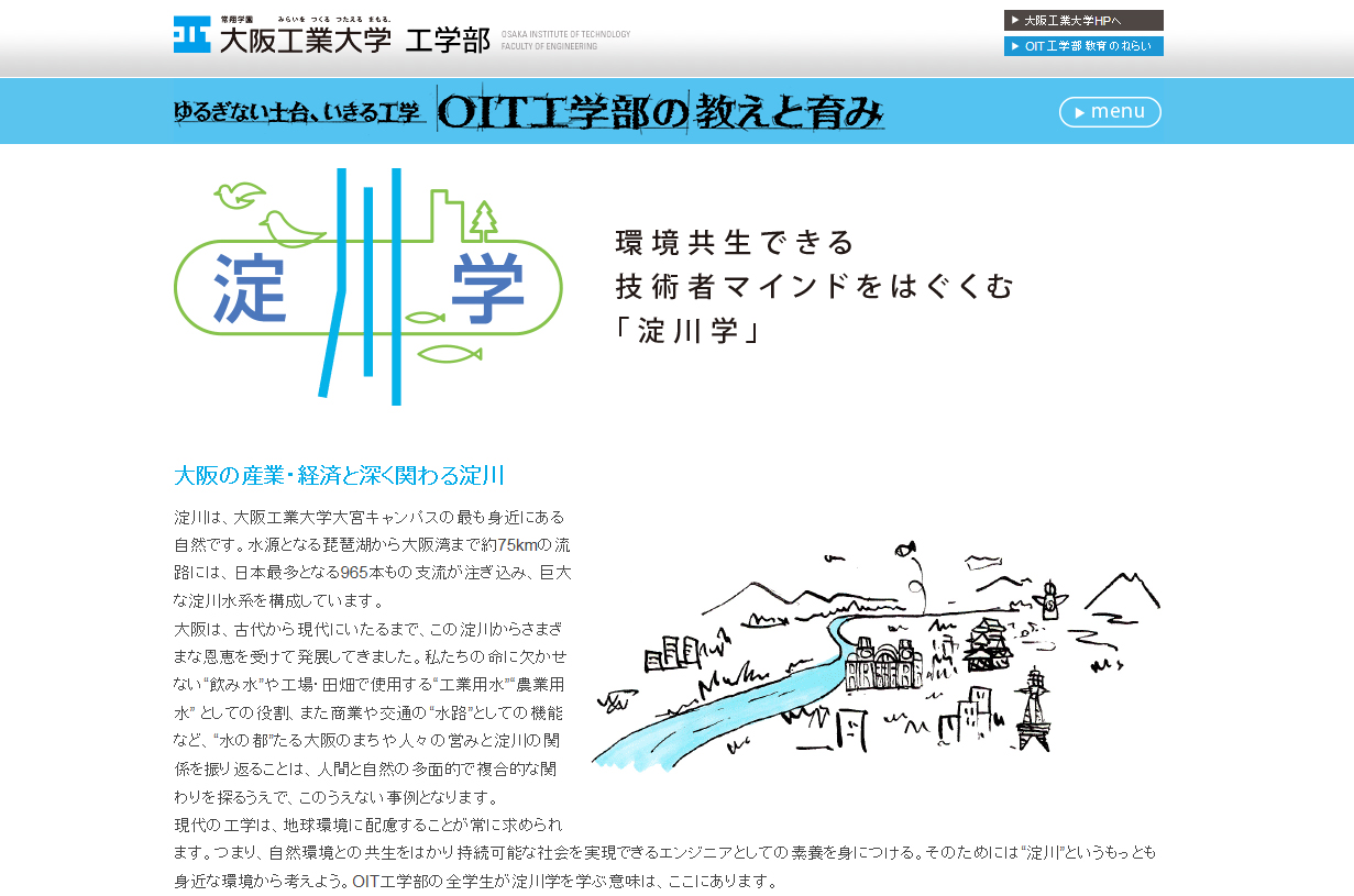 大宮キャンパスの傍らを流れる淀川を題材に、自然と人間の「環境共生」を考える同大独自の学び。自然の大切さを理解し、環境負荷の少ないものづくりを実践するエンジニアとしてのマインドを養う。分かりやすいイラストとともに、淀川学や環境問題を解説している。