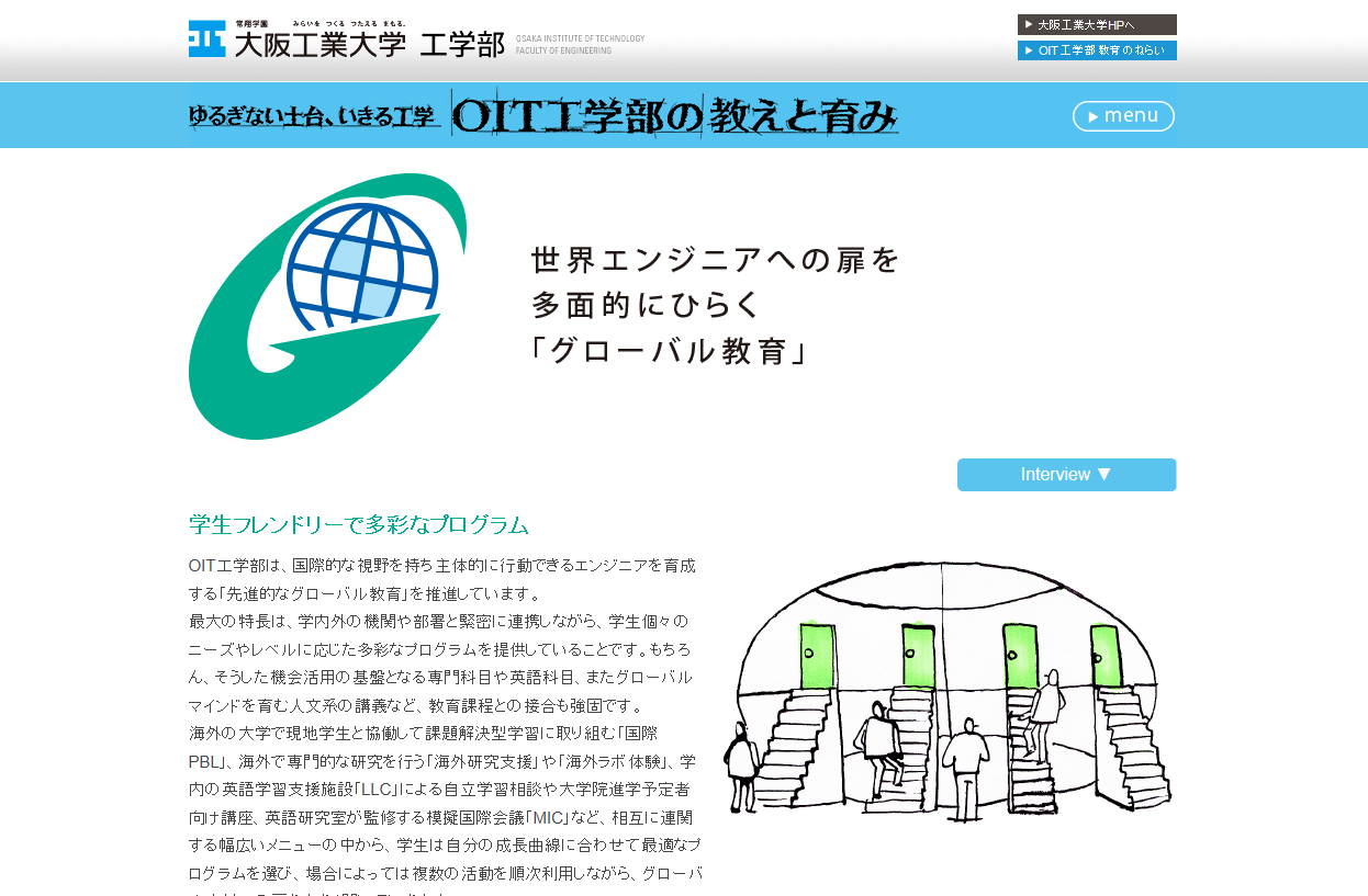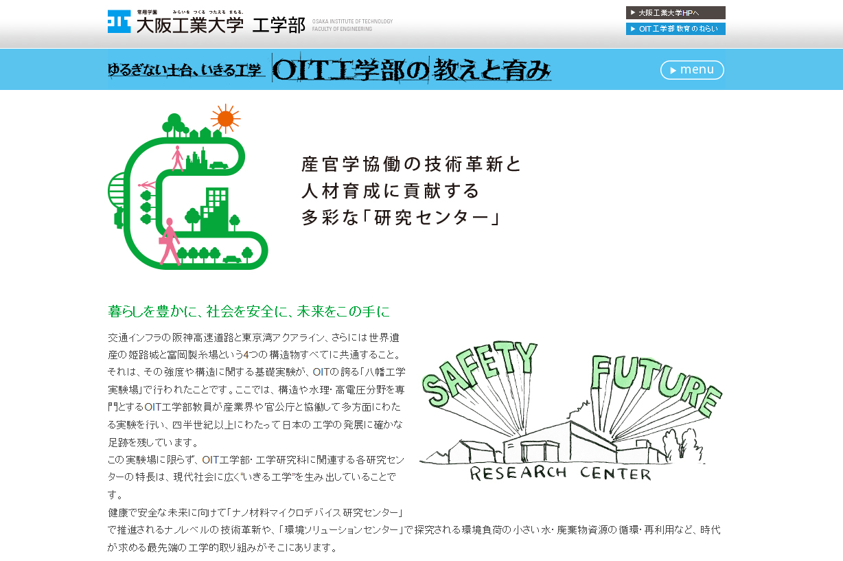 このたび開設したWebサイト「ゆるぎない土台、いきる工学 OIT工学部の教えと育み」(図1参照)では、クリッカブルマップ(イラストの一部をクリックすると、目的のページに移動)を効果的に活用し、工学部の6つの特長を解説。先駆的な教育が有機的に、そして堅固に結びつきながら“ゆるぎない土台”を提供し、世界の未来をより豊かに変革していく“いきる工学”を身に付けた人材を創出する工学部の教育システムを紹介している。各ページとも、親しみやすいイラストで、見る者に工学の魅力をイメージさせる構成としている。