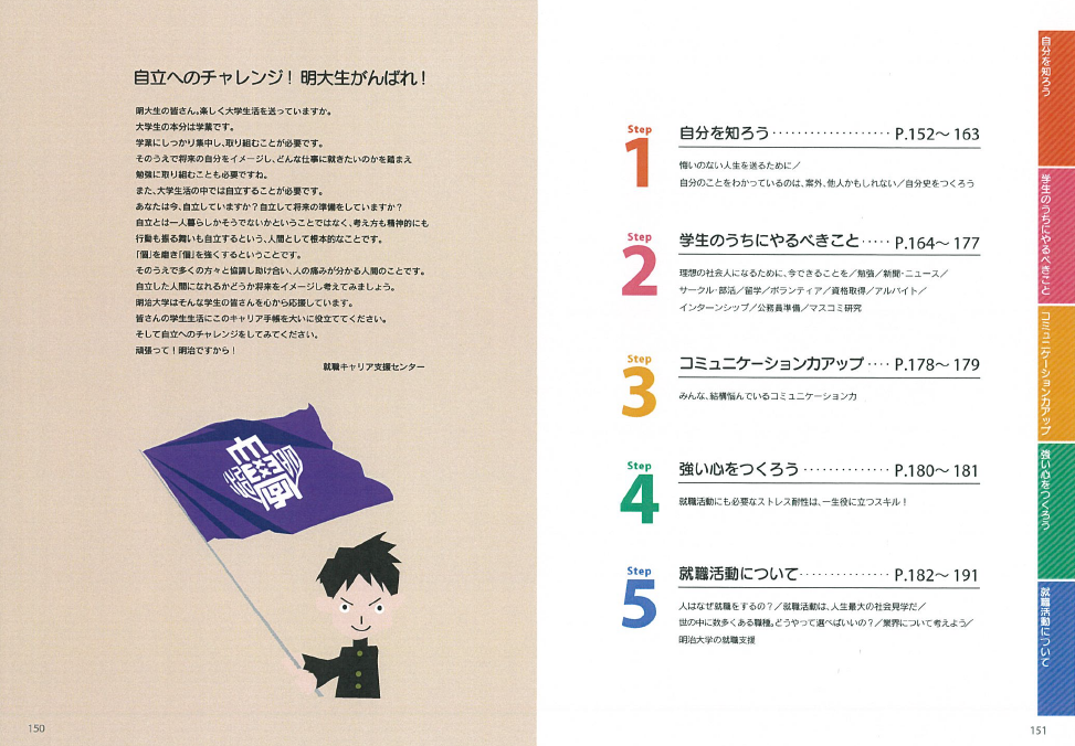 B6サイズ、全191頁で構成されるこの明治大学オリジナルの「キャリア手帳」は、2015年4月から2016年9月までの月間・週間のスケジュール管理ができる。また、「自分を知る」「学生のうちにやるべきこと」「コミュニケーション力アップ」「就職活動について」といったテーマで、学生自らがキャリアデザインを考えるきっかけを与える情報が掲載されており、3年次(2016年10月)に配布する「就職活動手帳」へ繋がる新たなツールとして、学生のキャリア支援の一助となることをねらいとしている。
