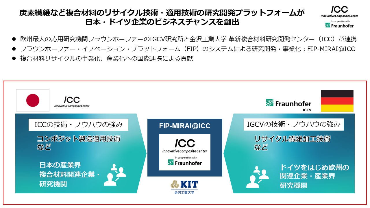金沢工業大学 革新複合材料研究開発センター(ICC)では、世界有数の応用研究機関であるフラウンホーファー研究機構(Fraunhofer-Gesellschaft)の鋳造・複合材料・加工技術研究所(以下「フラウンホーファーIGCV」)との共同研究開発・事業化拠点として「FIP-MIRAI@ICC」をICC内に立ち上げました。