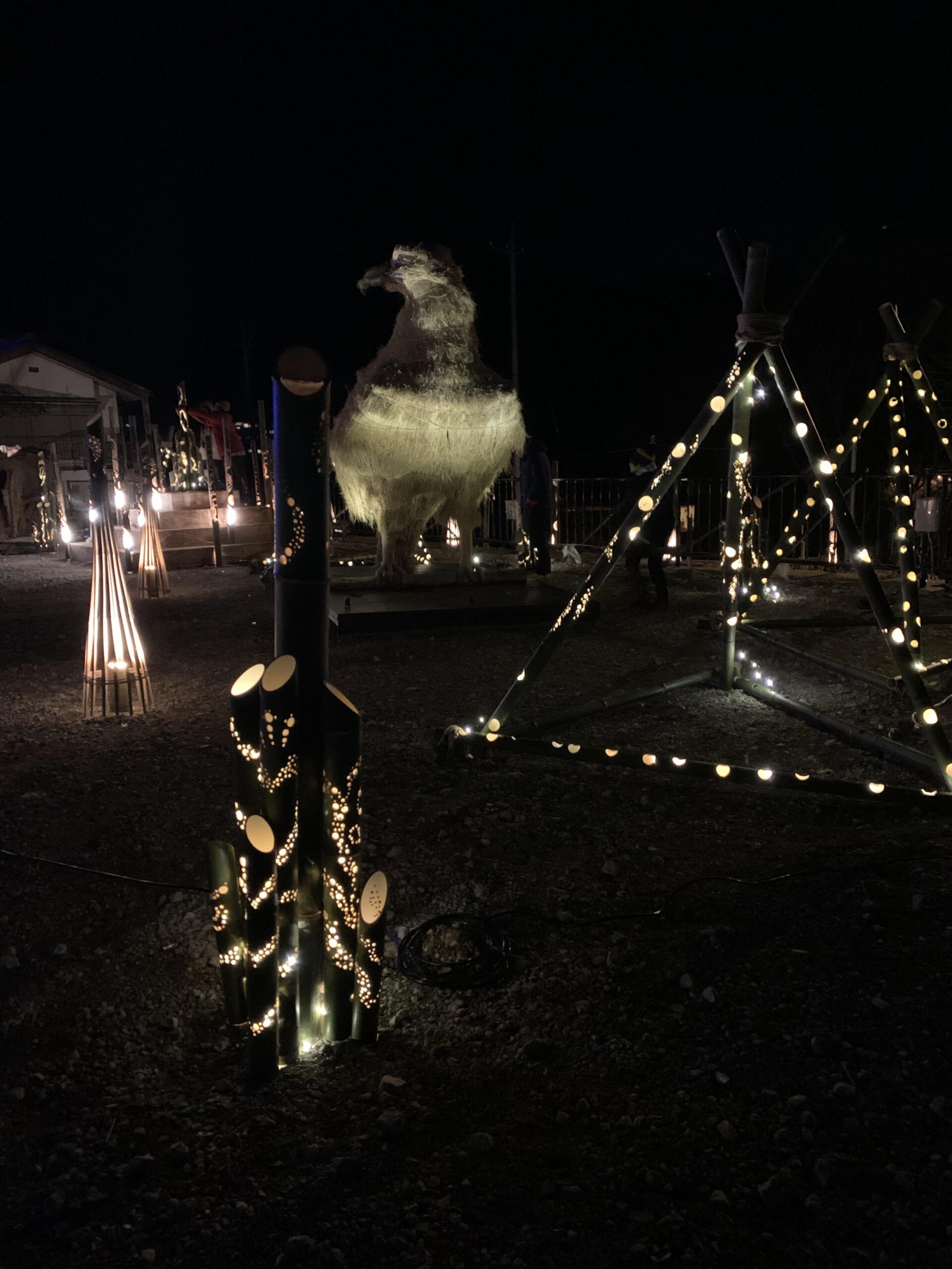 竹に無数に開けられた穴からこぼれる光は、温かく濃紺の空間に漂い、幻想的な夜の風景を演出しています。