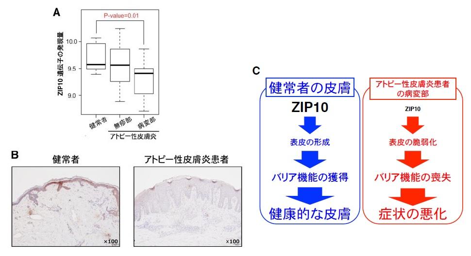 皮膚のバリア機能は、皮膚からの水分の蒸散や外来成分の侵入を防ぐ重要な役割を担っている。その機能の喪失は、アトピー性皮膚炎をはじめとするさまざまな皮膚病の症状として現れるが、ヒトの皮膚疾患におけるZIP10の関与は明らかにされていなかった。