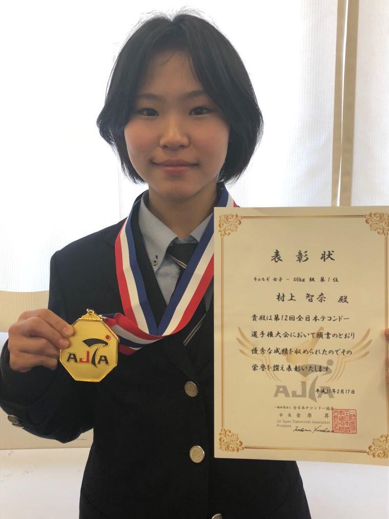 2年生スポーツコースの村上智奈さんは、全日本テコンドー協会の指定強化選手となっている。3歳からテコンドーを始め、近年は「全日本テコンドー選手権大会」「全国少年少女選抜テコンドー選手権大会」などで優勝。7月に行われた「JOCジュニアオリンピックカップ 第12回 全日本ジュニアテコンドー選手権大会」でも、キョルギ種目の高校生女子-46kg級で昨年に続き優勝を飾っており、同月の「第10回 アジアジュニアテコンドー選手権大会」ではベスト8という成績を残している。