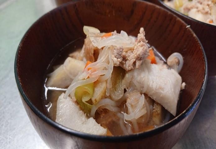 「いものこ」とは里芋のことです。岩手県には美味しい里芋があり、秋の味覚というと真っ先に「芋の子汁」が浮かぶそうです。鶏もも肉をミンチすることで旨味を出しています。