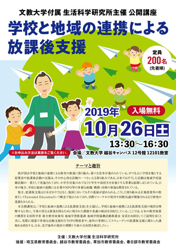 ・文教大学付属生活科学研究所が「学校と地域の連携による放課後支援」をテーマに公開講座を開催。