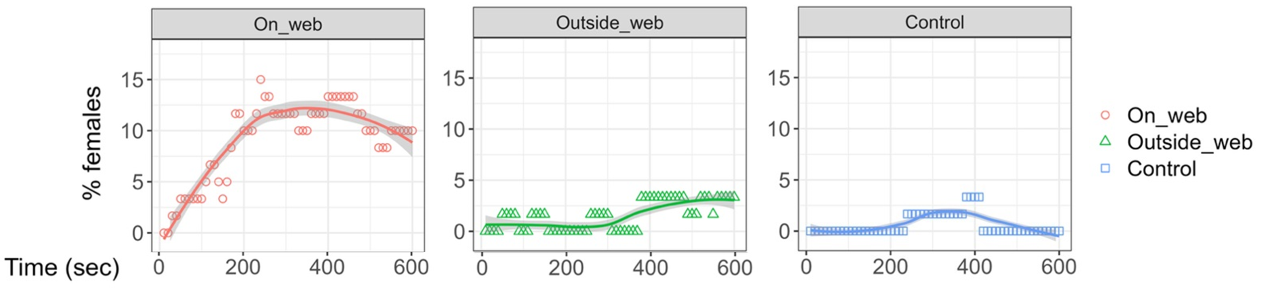 ・巣網に微小なガラスビーズを振りかけると、多くのメス成虫が巣外に出てパトロールを開始する。