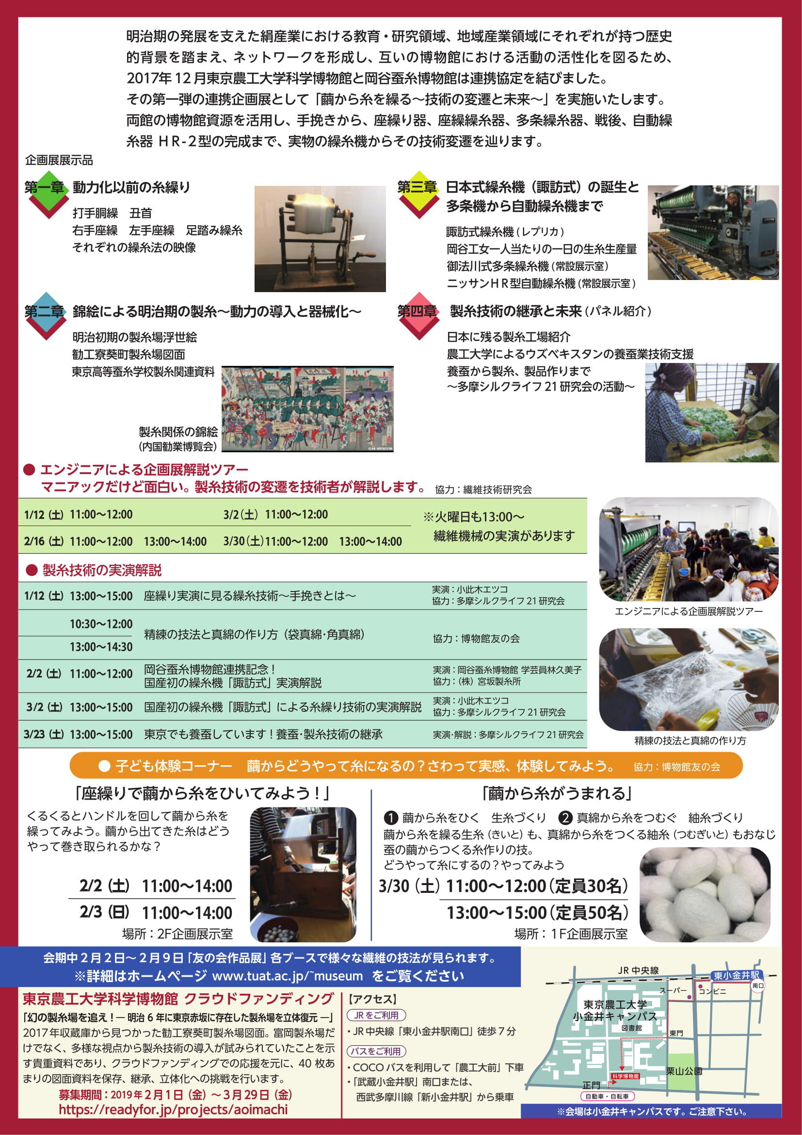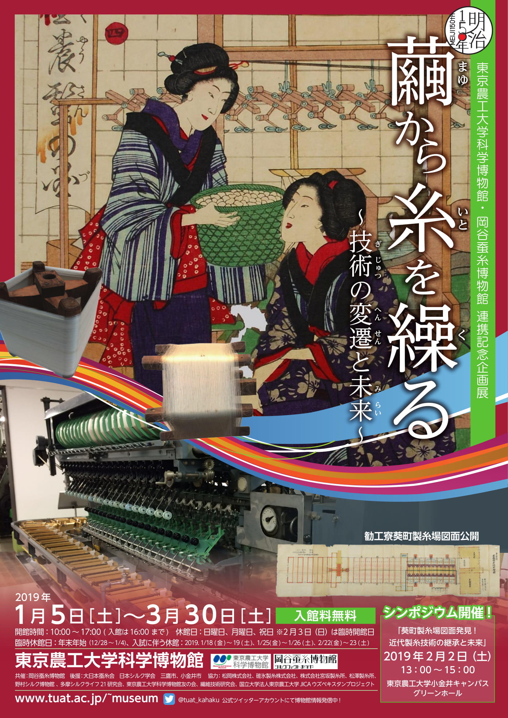 2017年に協定を締結した岡谷蚕糸博物館との連携による開催。実物の繰糸機からその技術変遷を辿る企画展で、葵町製糸場図面を公開中。期間中には上記シンポジウムのほか、エンジニアによる企画展解説ツアーや製糸技術の実演解説、子ども体験コーナーなども実施している。