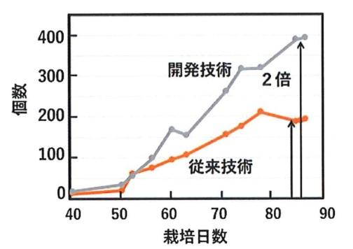このLEDによる照射を行った(図1)結果、栽培開始から50日目あたりから生育に差が出はじめ、苗木1本あたりの果実数は85日後に2倍になった(図2)。さらに、トマトの木の高さは1.5倍になり、糖度は15%向上した。