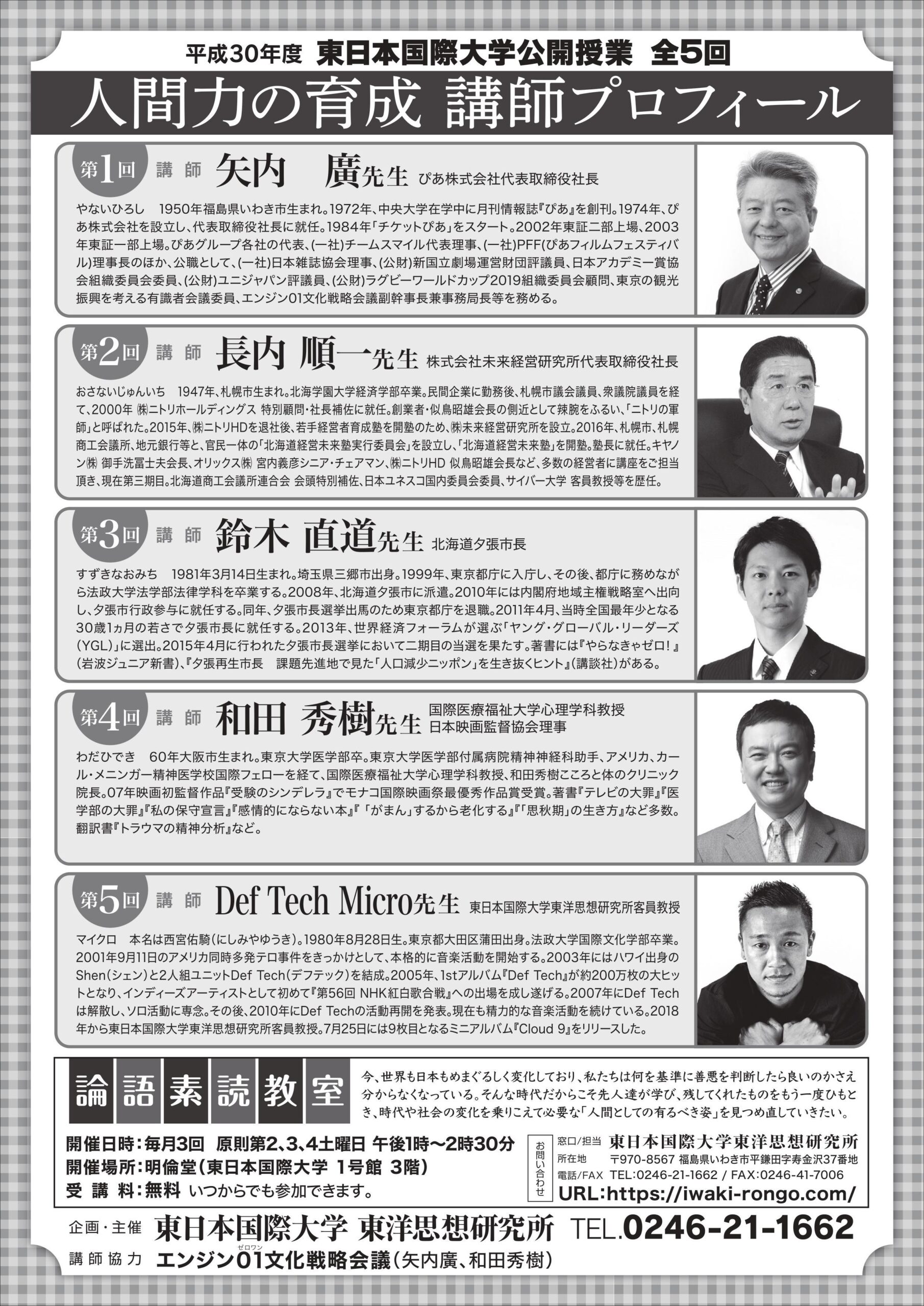 東日本国際大学(福島県いわき市)は10月13日(土)~来年1月12日(土)まで、公開授業「人間力の育成」(全5回)を開催する。同大では毎年、必修科目「人間力の育成」の中で、著名な外部講師を招いた公開授業を実施しており、今年度はぴあ株式会社代表取締役社長の矢内廣氏や北海道夕張市長の鈴木直道氏、音楽ユニット「Def Tech」のMicro氏らを招請。地域住民が学生とともに、「志をもってやり抜く力」を学ぶ。要申し込み。