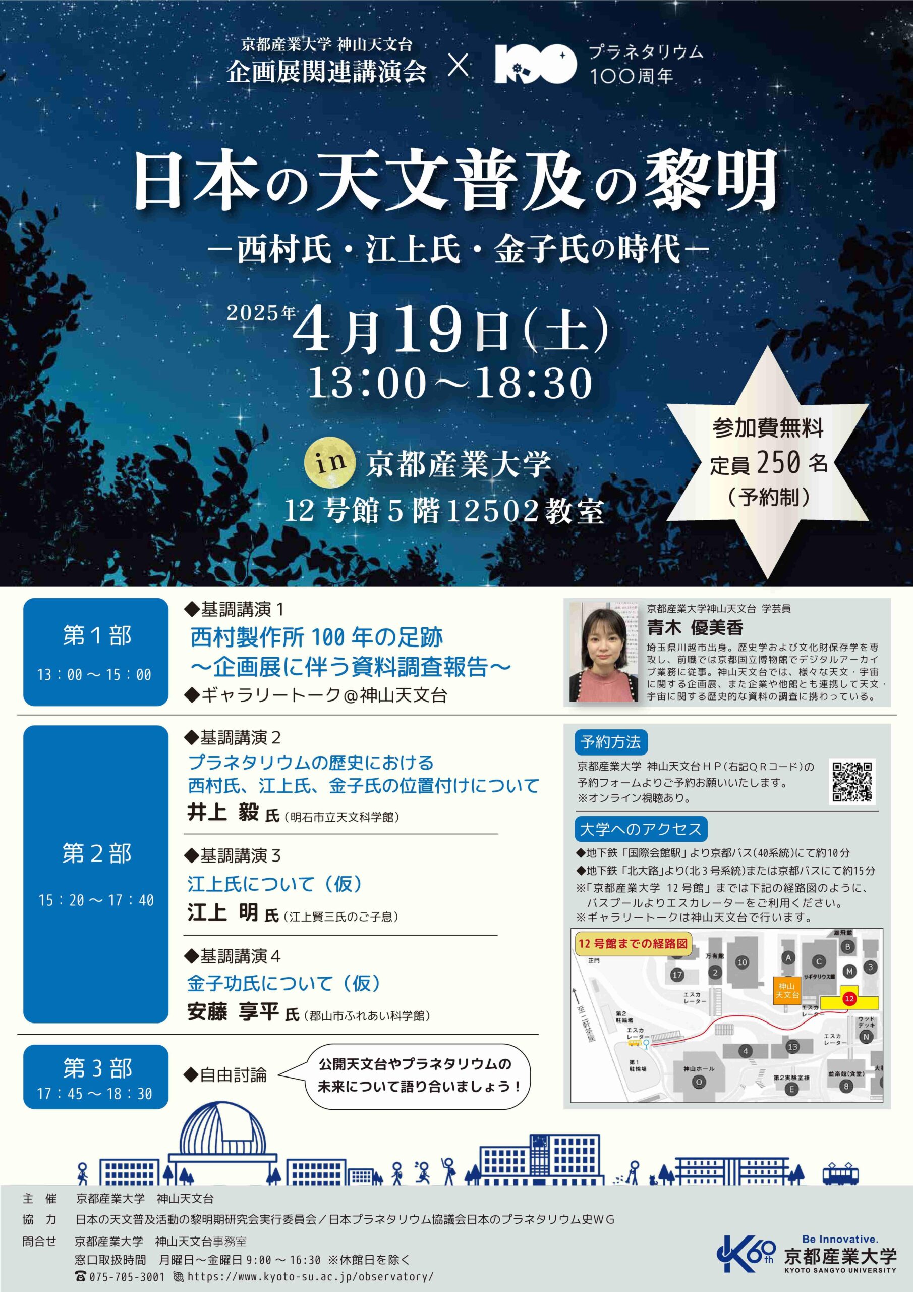 現在、京都産業大学神山天文台では企画展「西村製作所と中村要~反射式望遠鏡にかけた夢~」を開催しています。この企画展の関連講演会および、プラネタリウム100周年記念事業公認企画として「日本の天文普及の黎明-西村氏・江上氏・金子氏の時代-」を開催しました。