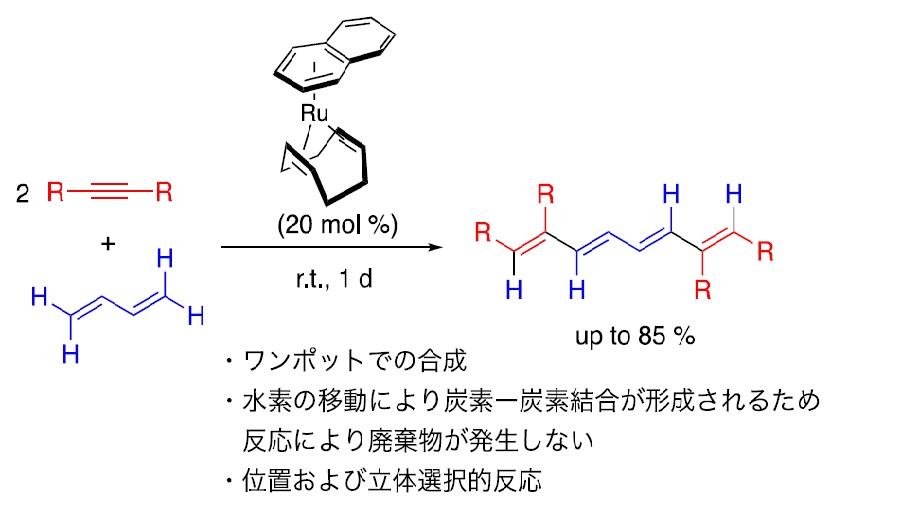 このように、共役ジエンとアルキンの直接的なカップリングにより、水素の分子間移動で炭素–炭素結合を形成し、共役テトラエンを合成する反応は世界で初めての方法となります。