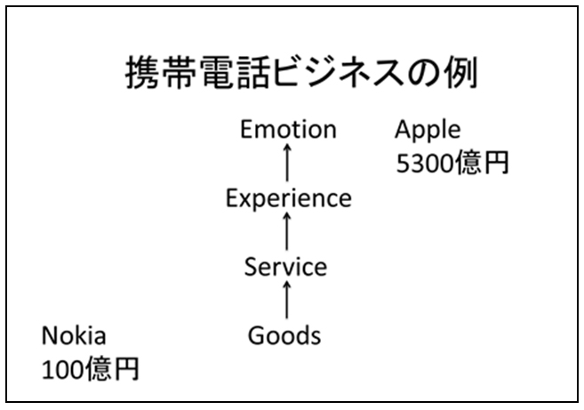 Nokiaでは携帯電話を製品(goods)としてとらえものづくりを行っていたが、Appleはそれをサービス、経験、感性という面を統合し、スマートフォンという形で実現した。これにより、100億円対5300億円というビジネス上の大きな差が生じた。
