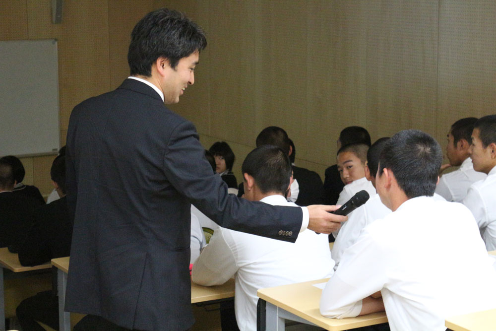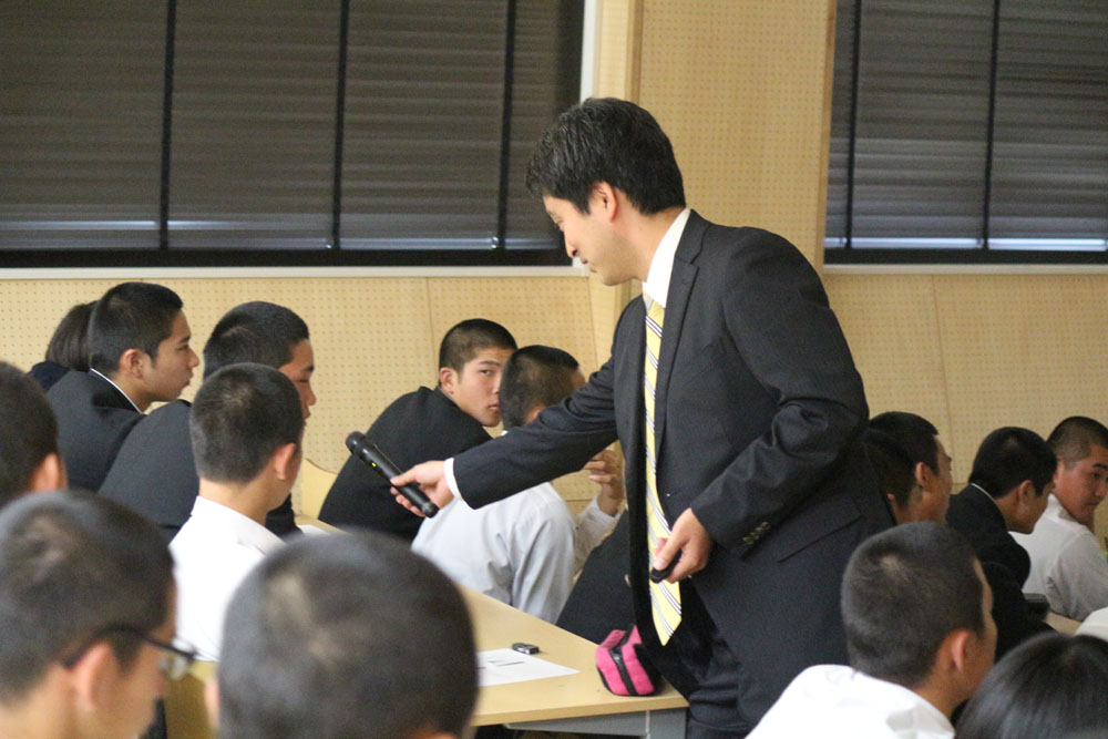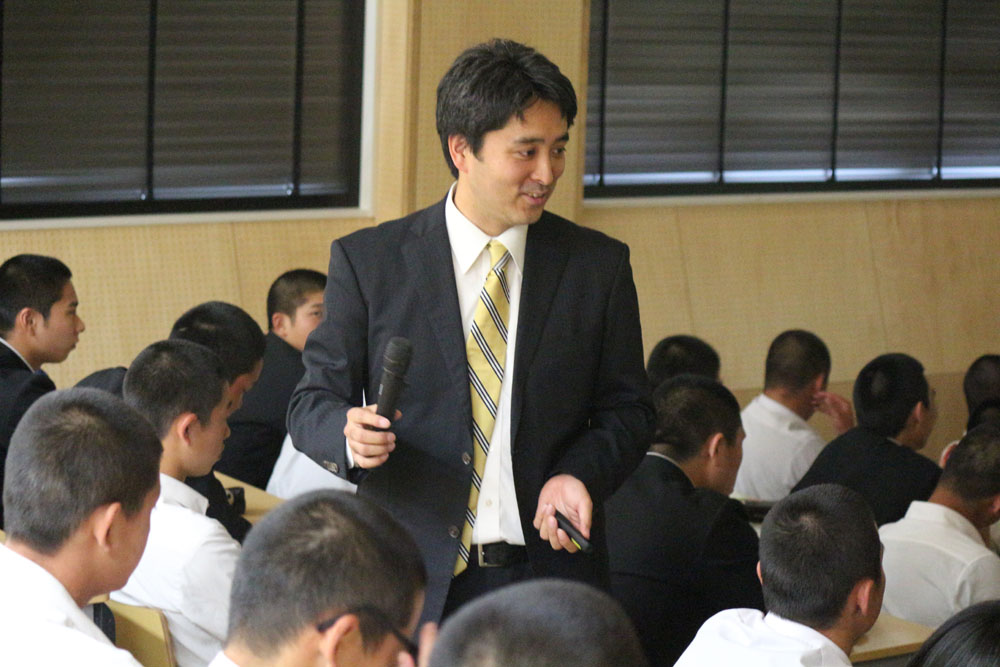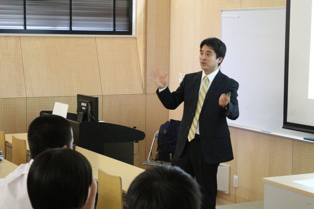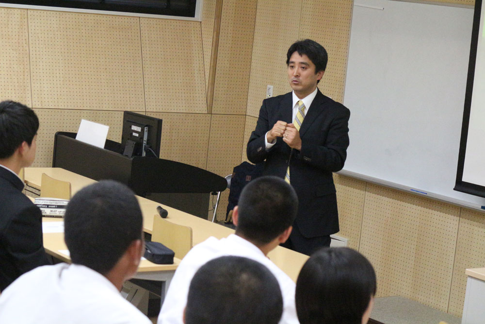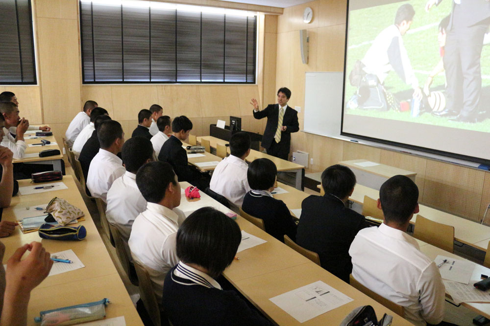 5月2日に行われた第3回目の出張講義には、同校スポーツクラスの2年生33名と1年生22名が参加した。同大医療技術学部スポーツ医療学科健康スポーツコースの本郷仁吾助教が、「スポーツ傷害」をテーマに講義。アスレティックトレーナーでもある自身の経験や資料映像を交えながら、スポーツ中の接触傷害を選手と指導者の側面から解説した。