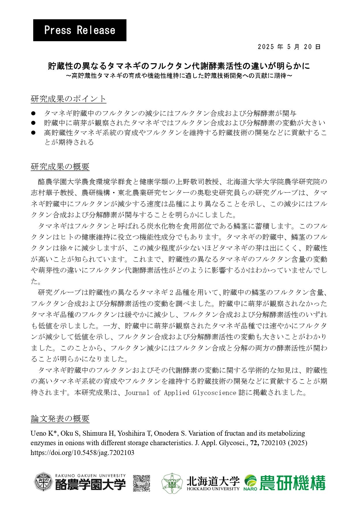 タマネギ貯蔵中のフルクタンおよびその代謝酵素の変動に関する学術的な知見は、貯蔵性の高いタマネギ系統の育成やフルクタンを維持する貯蔵技術の開発などに貢献することが期待される。本研究成果は『Journal of Applied Glycoscience』誌に掲載された。